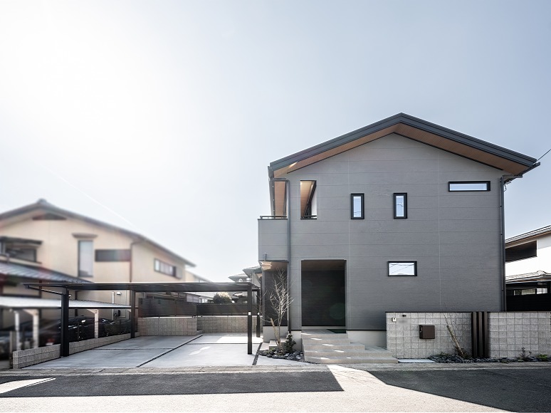 フラットな屋根形状が建物の水平ラインと美しく呼応し、広々とした土間コンクリートの駐車スペースを、すっきりと機能的に見せています。