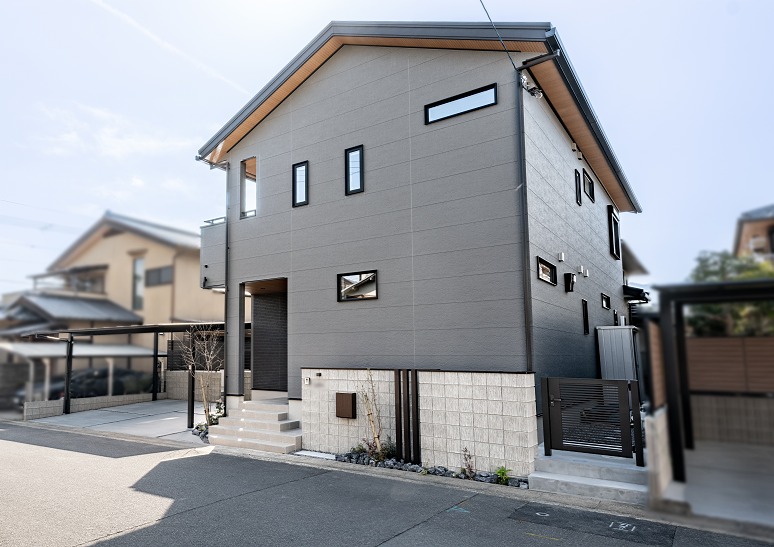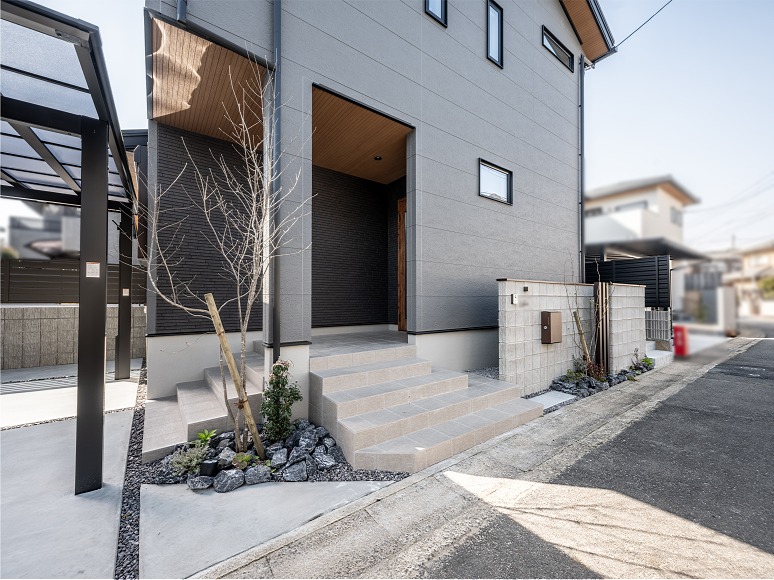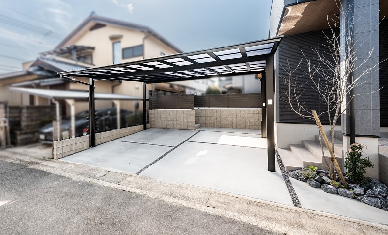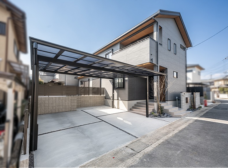 LIXIL「ネスカF」2台用のシャープなカーポートや、ユニソン「エリダ」を使った門塀、すっきりとした階段まわりが調和し、建物の端正な佇まいを引き立てます。