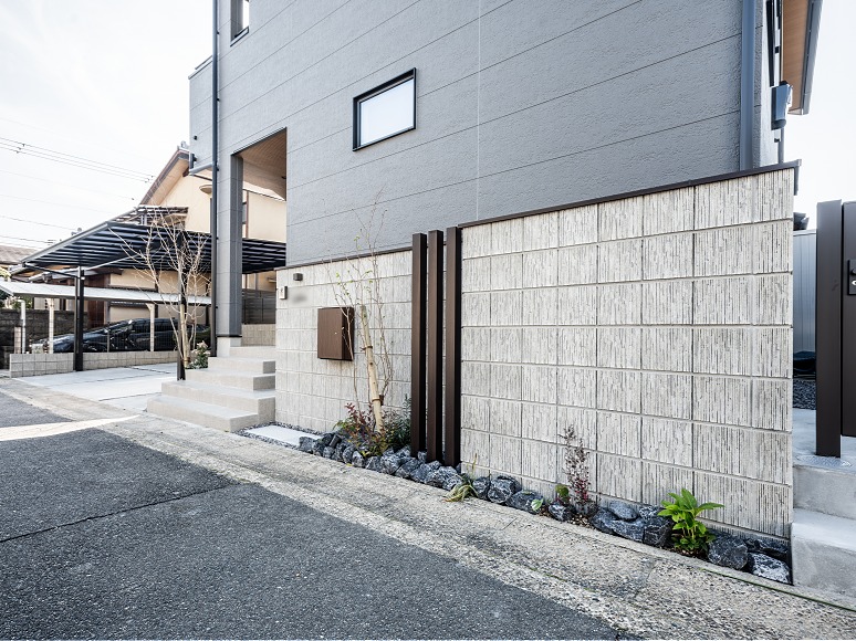 門塀に使用した化粧ブロックは、ユニソン「エリダ」です。エリダは天然石を思わせる自然な意匠で、植栽とも違和感なくなじみます。塀の天端をきれいに納めるダークブラウンの笠木も取り付け、シャープな印象にまとめました。