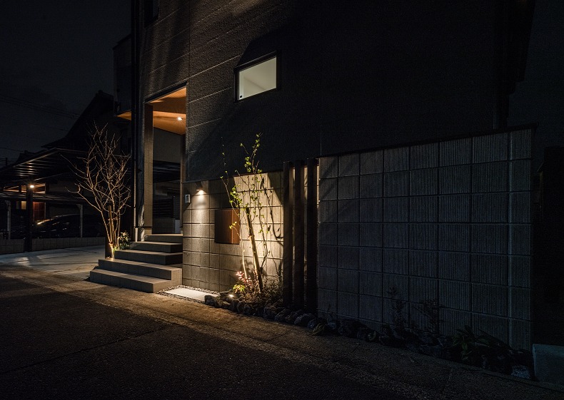 壁面灯と植栽灯の光によって、素材の凹凸や植栽のシルエットが引き立ち、玄関まわりをドラマチックに演出します。