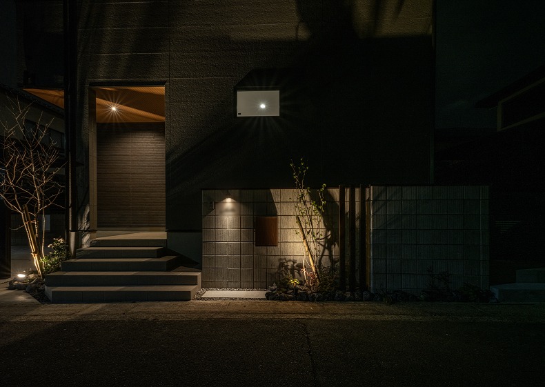 門塀も昼とは違う陰影をまとい、落ち着きのあるエントランスを印象づけます。