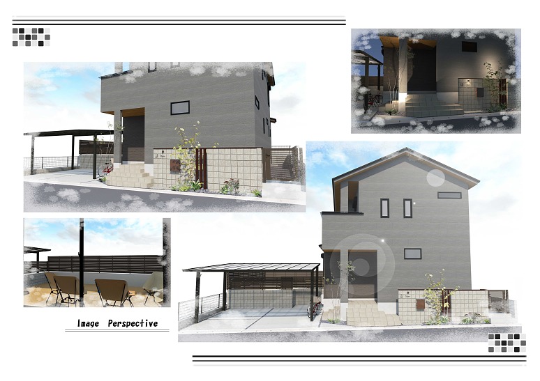 昼は、カーポート・門塀・タイルデッキを端正に組み合わせた、機能的で美しいエクステリア。