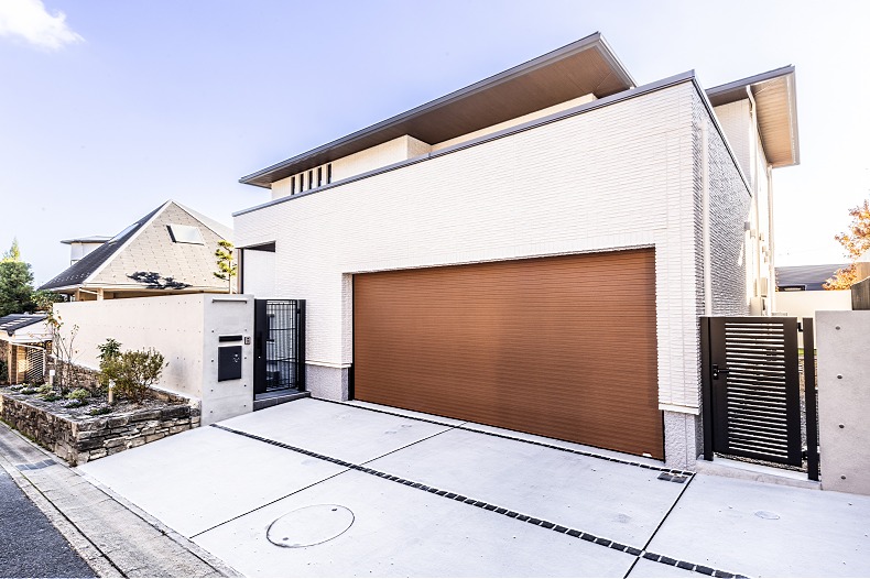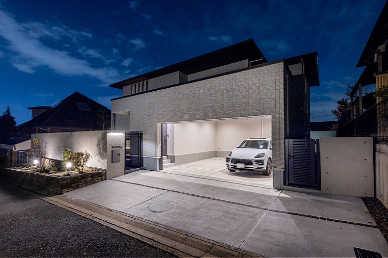 公道に面した車庫周りは機能的な土間コンクリートで舗装し、ガレージ前は滑りにくい刷毛引きで、中は清掃が楽なコテ押さえで仕上げ、用途に応じて使いやすく。