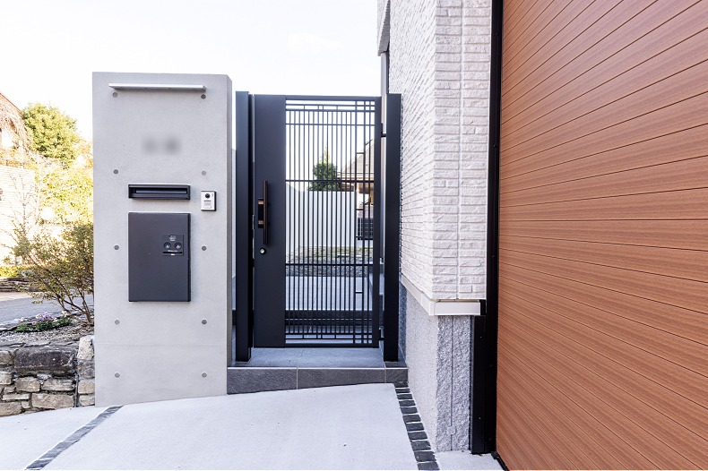 玄関へ向かう門は、ブラックの細格子デザインがスタイリッシュな片側門扉でクローズしました。夜はシンプルかつモダンな照明が灯り、門周りを明るく照らします。