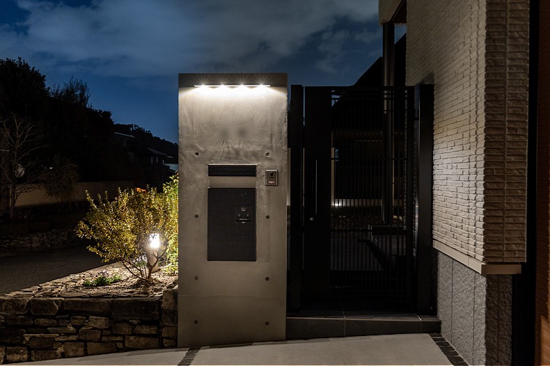 玄関側のグランドアートウォールの門袖にはポストやサイン、宅配ポスト、照明などを組み込んで、玄関先に必要な機能を美しく集約させました。