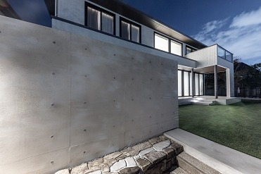 コンクリート打ち放し仕上げのグランドアートウォールで家周りをクローズした、プライバシーを守るモダンなエクステリアです。
