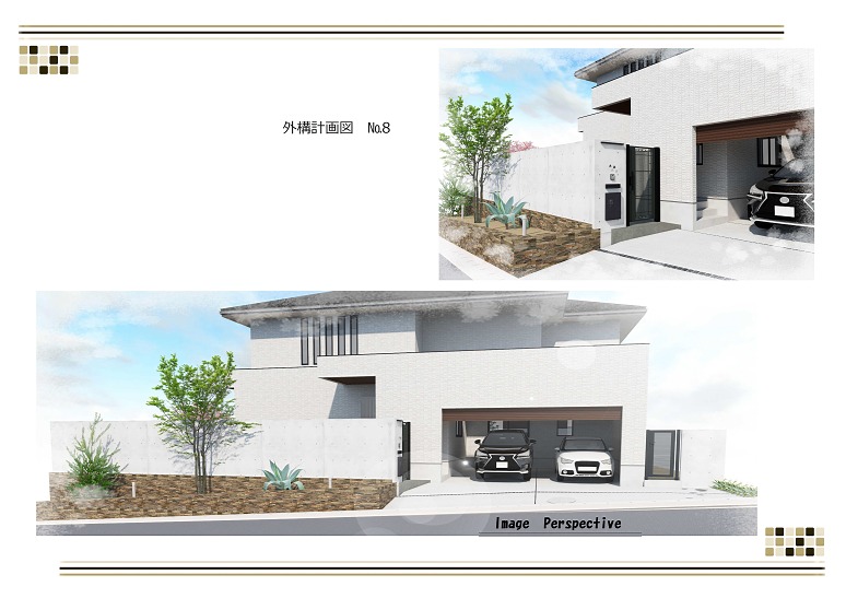 敷地外周を囲うウォールは、天端・側面・道路側はモダンなコンクリート打ち放し仕上げに、建物側は明るいグレーのガウカラーで仕上げ、一つの壁で二つの異なるスタイルを楽しみます。