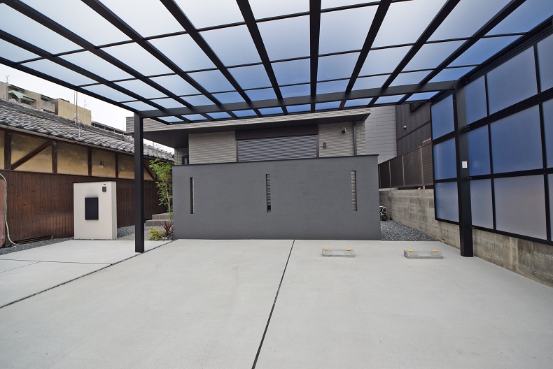 京都市H様邸 広々駐車場をサイドパネル付きの「ネスカF」でカバー。グランドアートウォールでテラスデッキを目隠しした、モダンで高機能なエクステリア