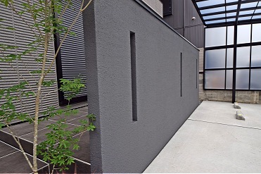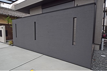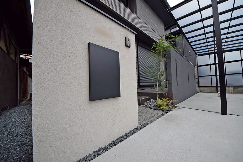 門柱はシンプルにジョリパットで仕上げ、グランドアートウォールと同じブラックのコーピング笠木を取り付けて、全体の統一感を図りました。