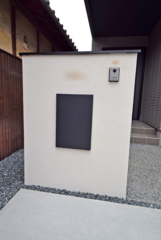 宅配ポストはナスタの「NastaBox+POST」です。重厚なマットブラックパネルが、シンプルな白い門柱をモダンに演出します。