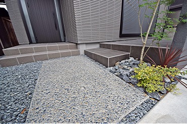 正面のタイル張りは玄関へのアプローチ、右手はテラスデッキへ向かう階段です。