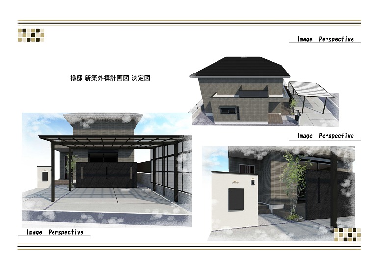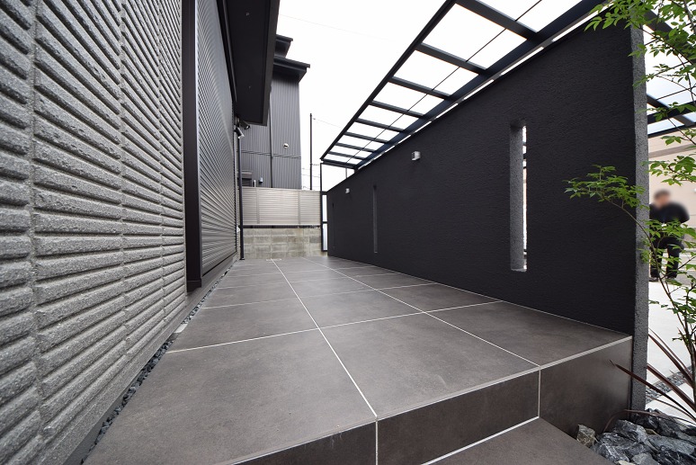 タイルデッキと駐車場の間にグレーのグランドアートウォールを設置した、生活空間のプライバシーに配慮したプランです。