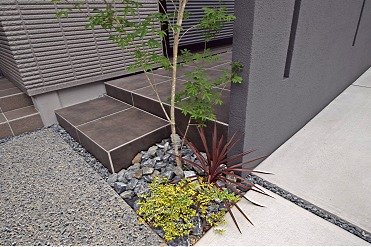 鮮やかで柔らかな植栽が、クールな外構にやさしさと彩りを添えています。