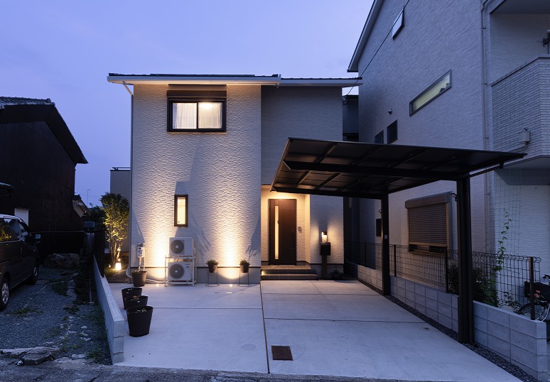 昼間はシンプル&クリーンに、夜はあたたかみのある光に包まれる、照明デザインが主役のモダンなエクステリアです。