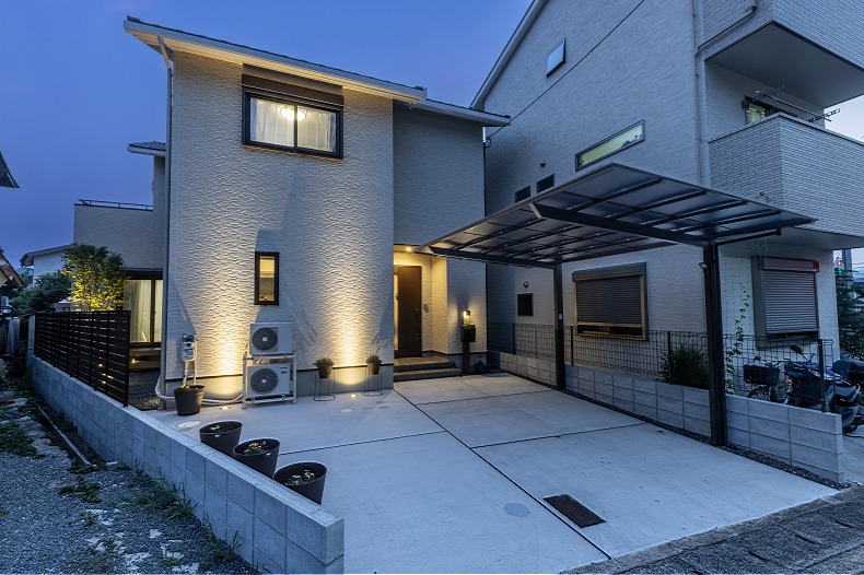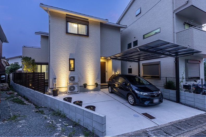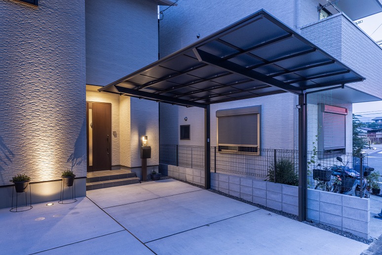 カーポートは、モダンなフラットデザインのLIXILの「ネスカF」(1台用)です。猛暑に対応した熱線吸収ポリカの屋根材仕様とし、快適性と耐久性を両立しています。