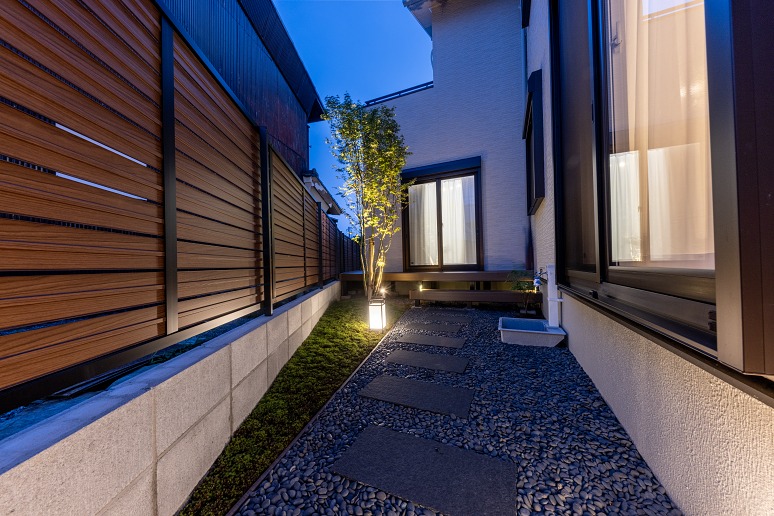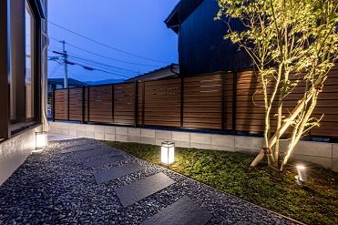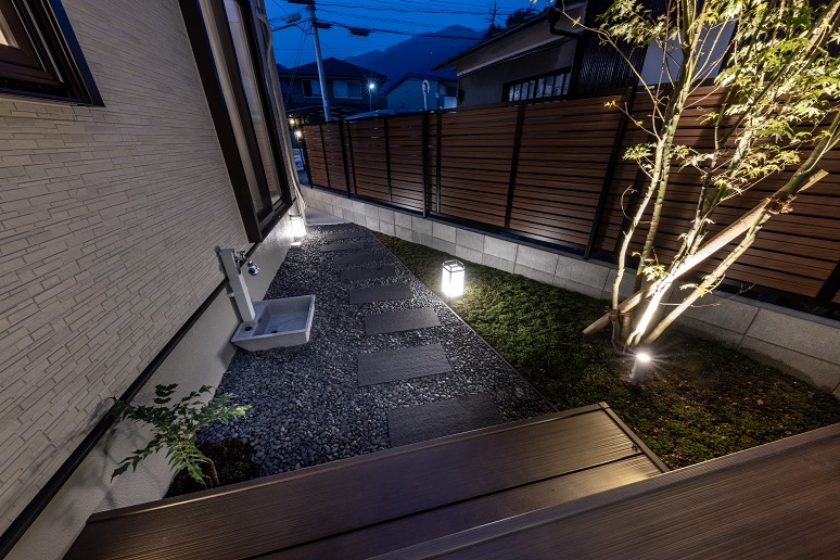 自然な夜景を楽しめるよう、照明はタカショーの「庭ゆらぎ」と「ガーデンアップライト」を組み合わせています。