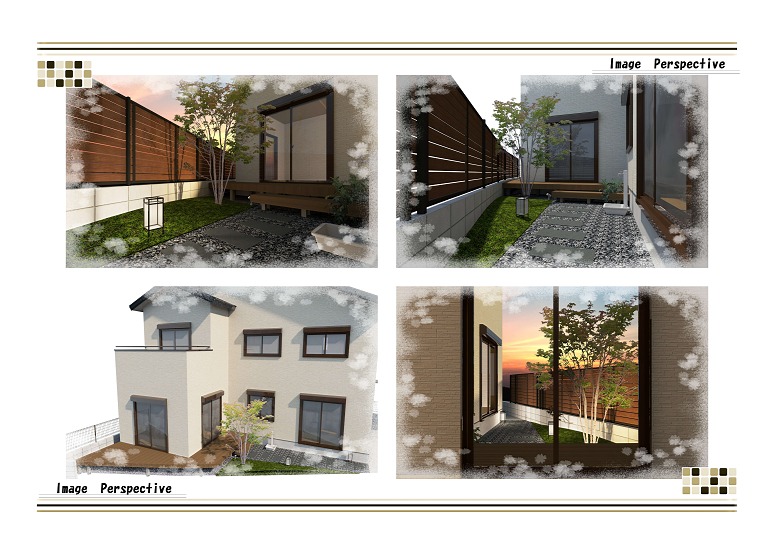 オータムブラウンの横板フェンスが隣地との視線をやわらかく遮り、あたたかみのあるナチュラルな空間をつくります。