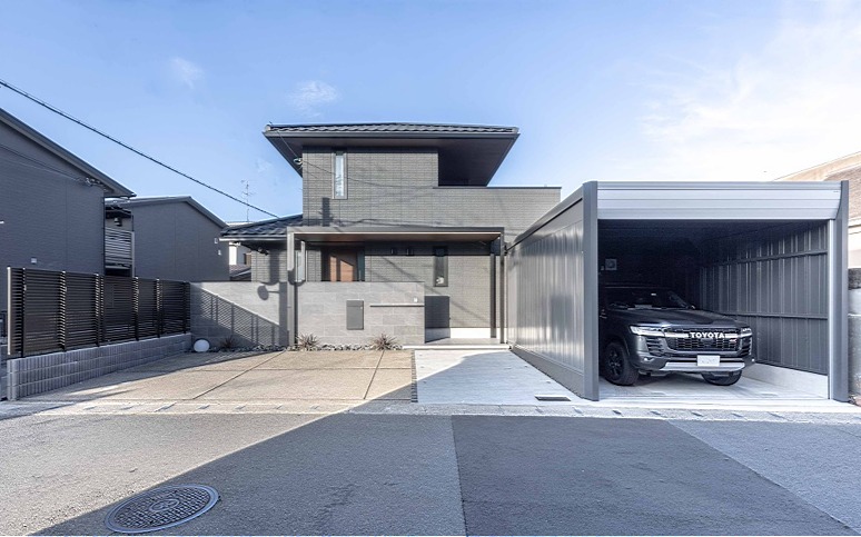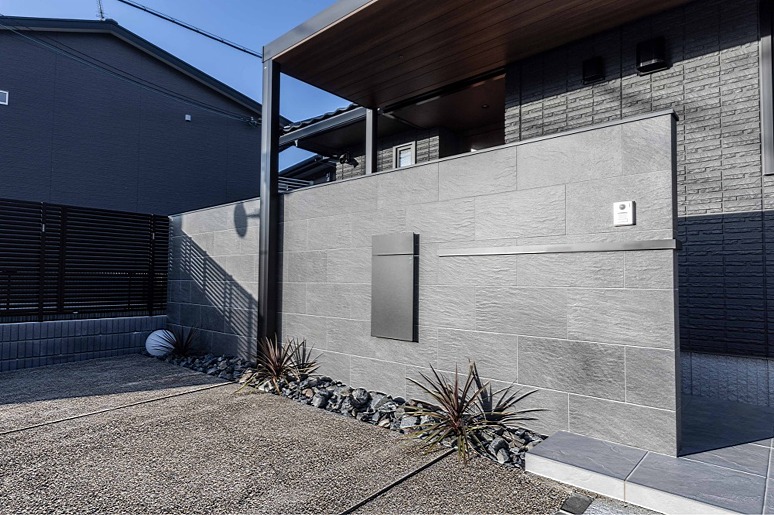 まず目に入るのは、グレーの外壁の家と一体となったかのような門塀と、広々とした駐車スペースです。