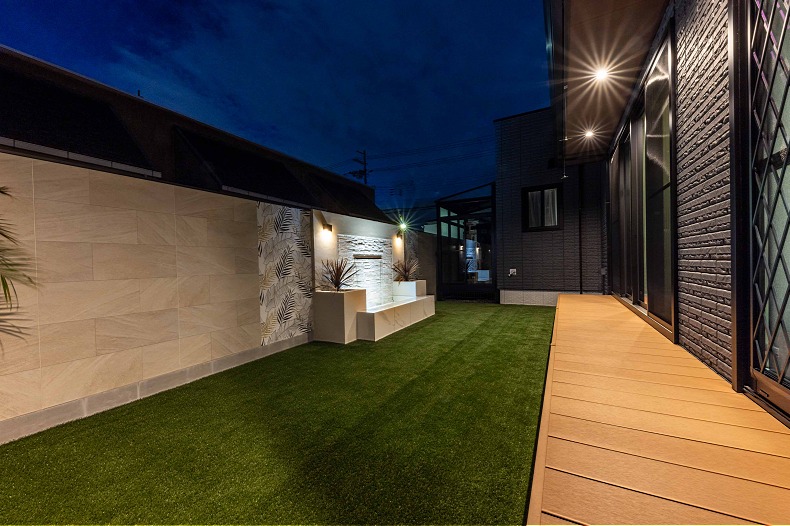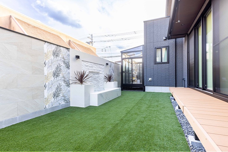 庭全体の足元には、ユニオンビズの人工芝「メモリーターフ」を敷き詰めて、芝刈りいらずの美しい緑を実現。