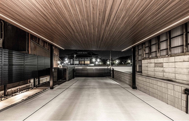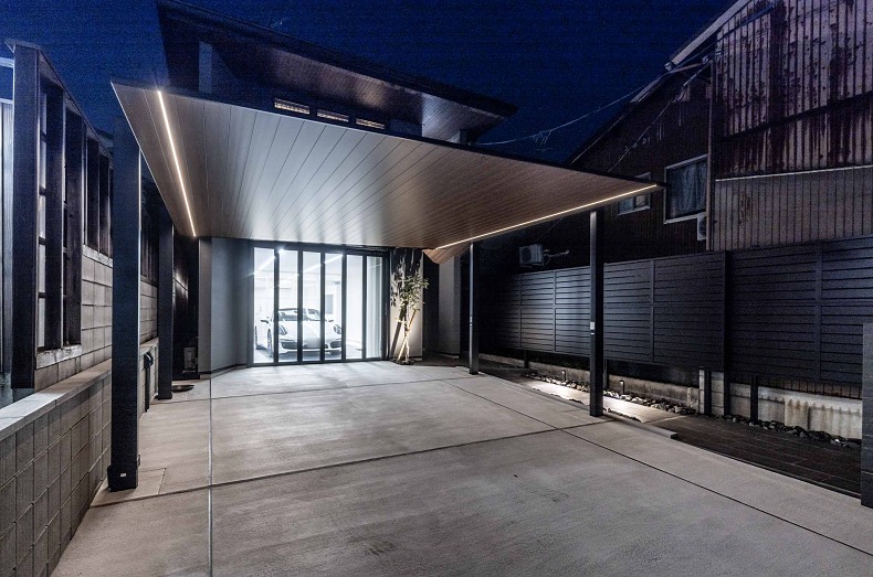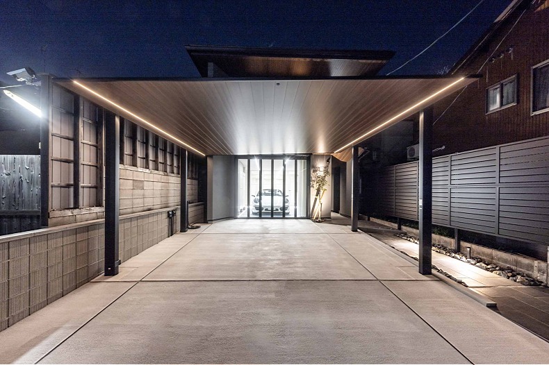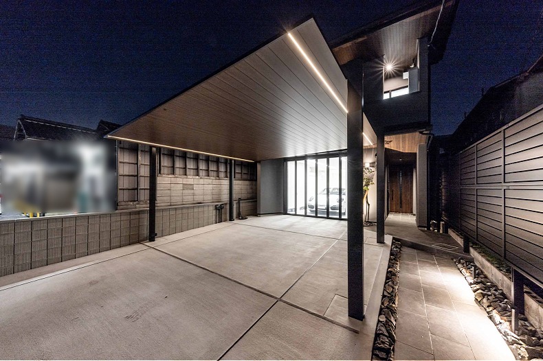 プライバシーを守り、生活動線も車の出入りもスムーズに、かつ昼はモノトーンでクールに、そして夜は柔らかな光のラインでもてなす。