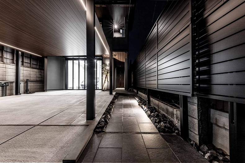 左手のアプローチは足元灯に沿って明るい導線を描き、奥行きのある陰影が端正なエントランスを印象づけます。