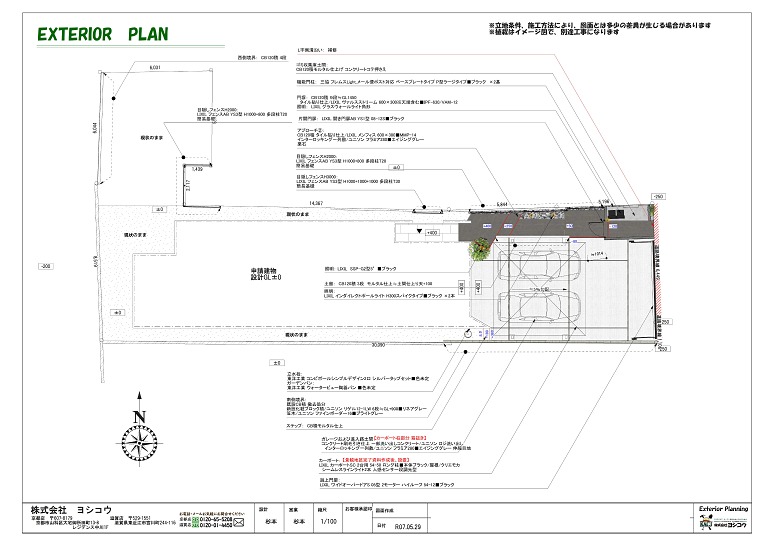 跳上門扉(カーゲート)と門袖、門柱、門扉でしっかりと道路境界をクローズした安心のエクステリアです。