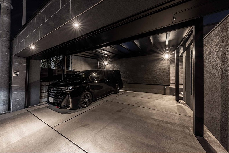 GAWにはダウンライトを取り付け、車の入出庫をサポート。カーポートの柱に防犯カメラも取り付け、防犯効果を高めています。