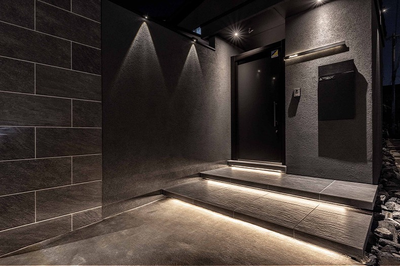 浮き階段にはラインライトを設置して夜間も明るく安全に。宅配ポストやサインなどもブラックで統一し、クールでモダンな印象に仕上げました。