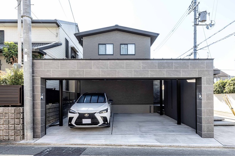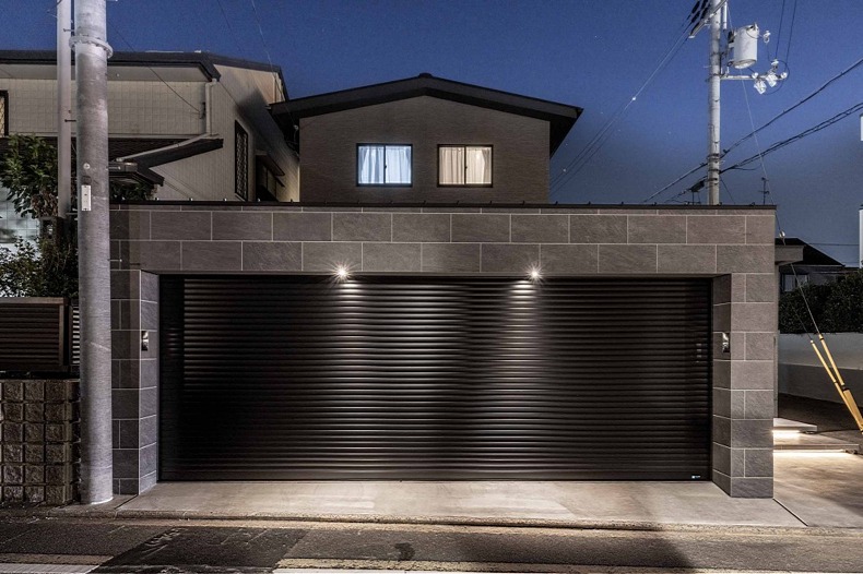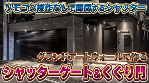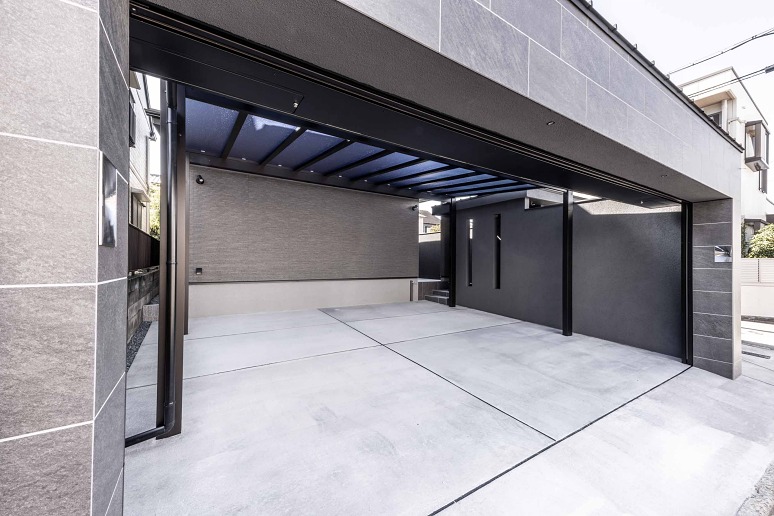 タイル仕上げのGAW(グランドアートウォール)シャッターゲートで、ガレージスペースをクローズしました。