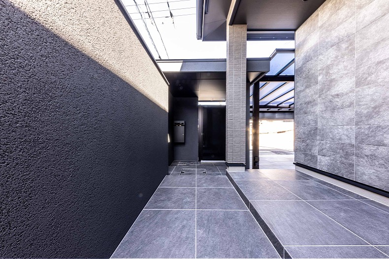 エントランスのアプローチ階段と玄関ポーチは、アイコットリョーワ「カリラ」で仕上げました。リアルなグレーの石目模様が、格調高い大人のエントランスを印象付けます。